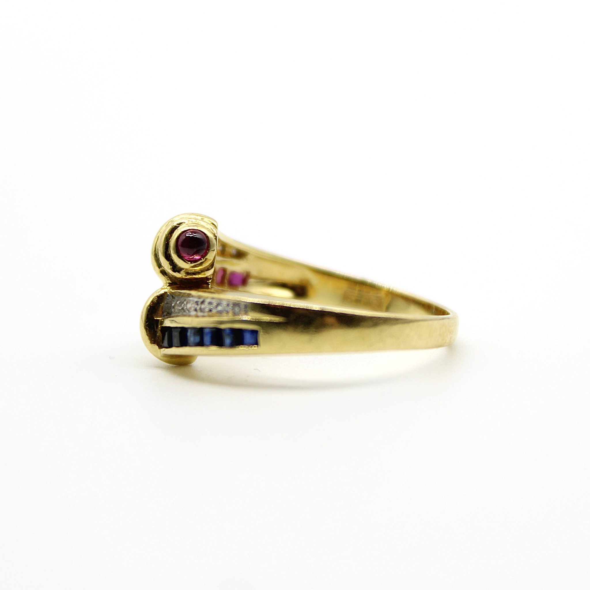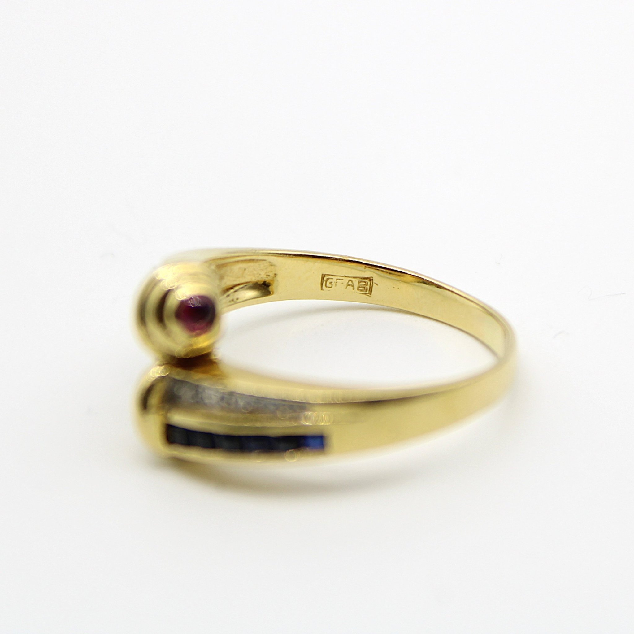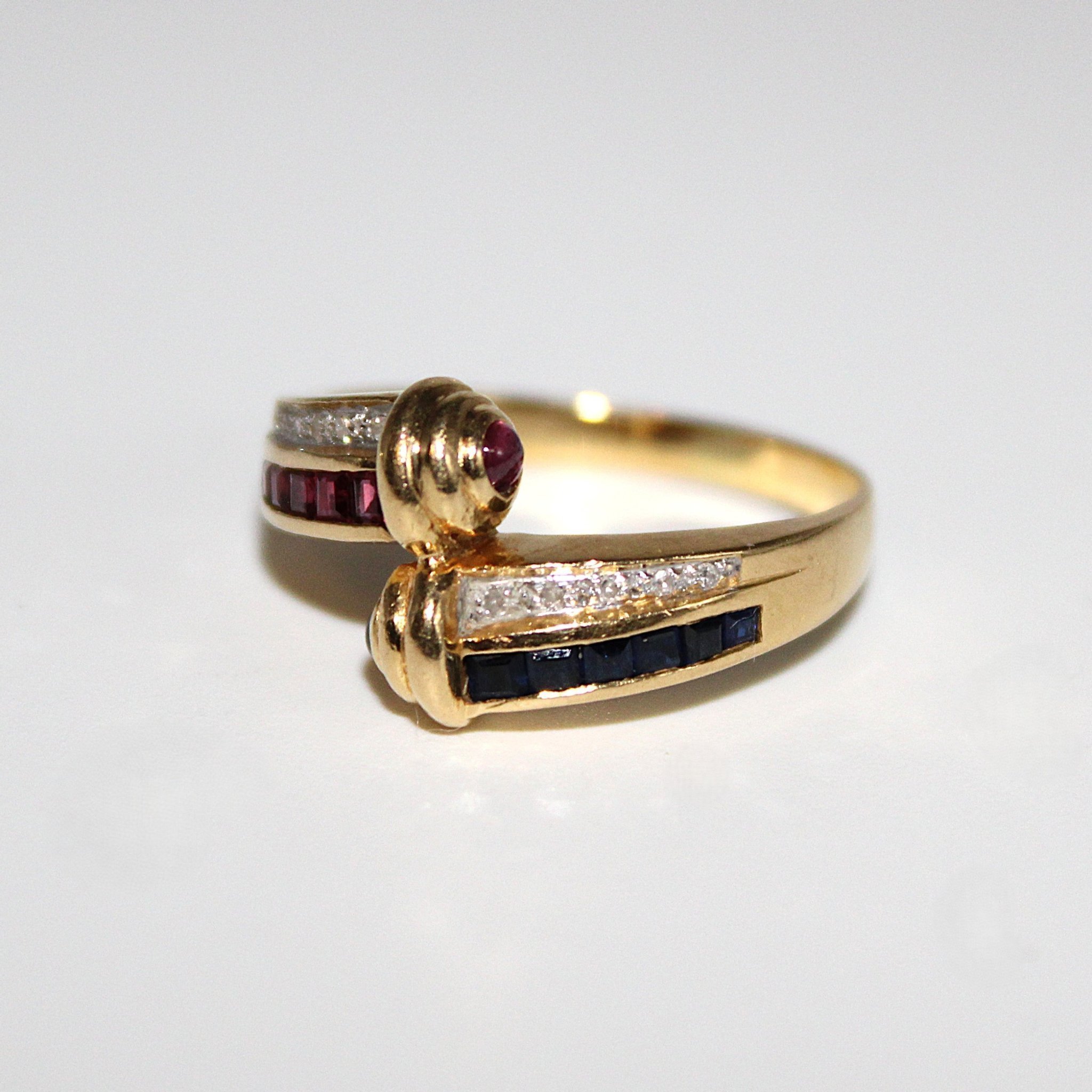 Unik ring i 18K guld, äkta diamanter, rubiner och safirer (0,23ct, stl 16,9mm)