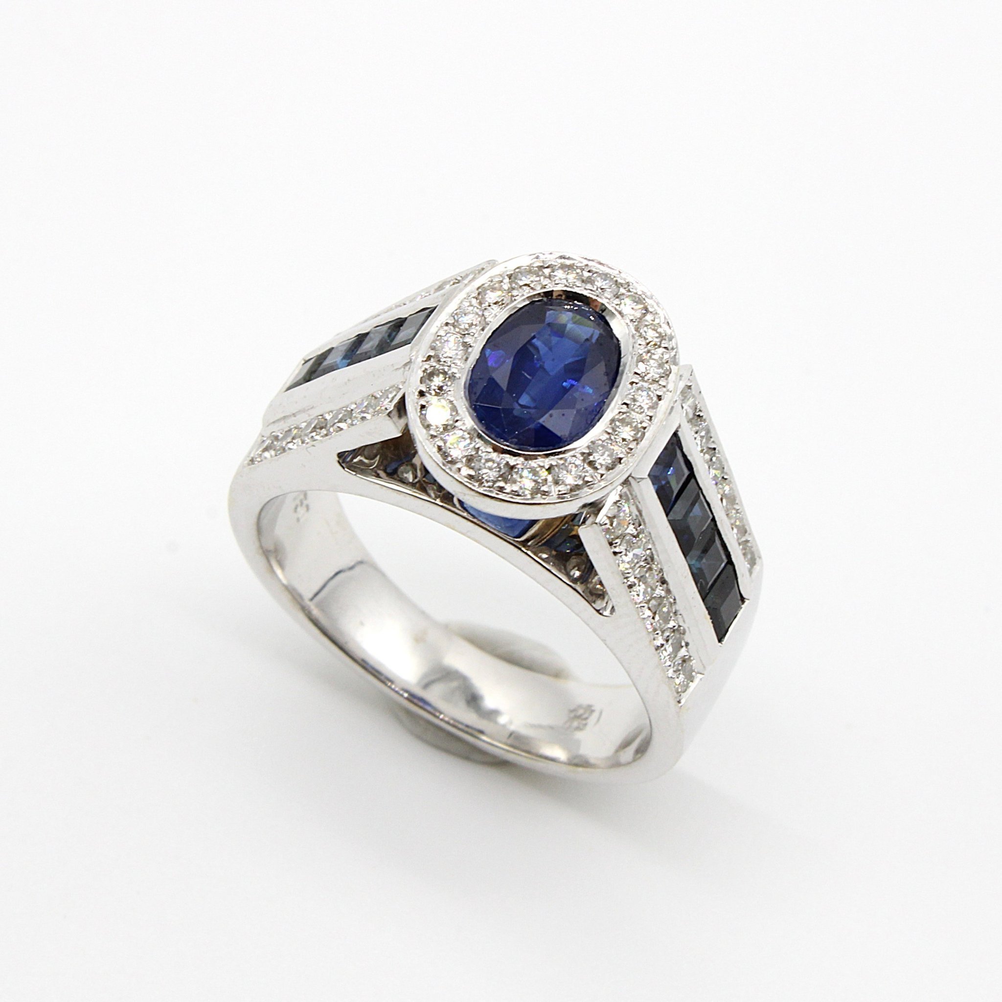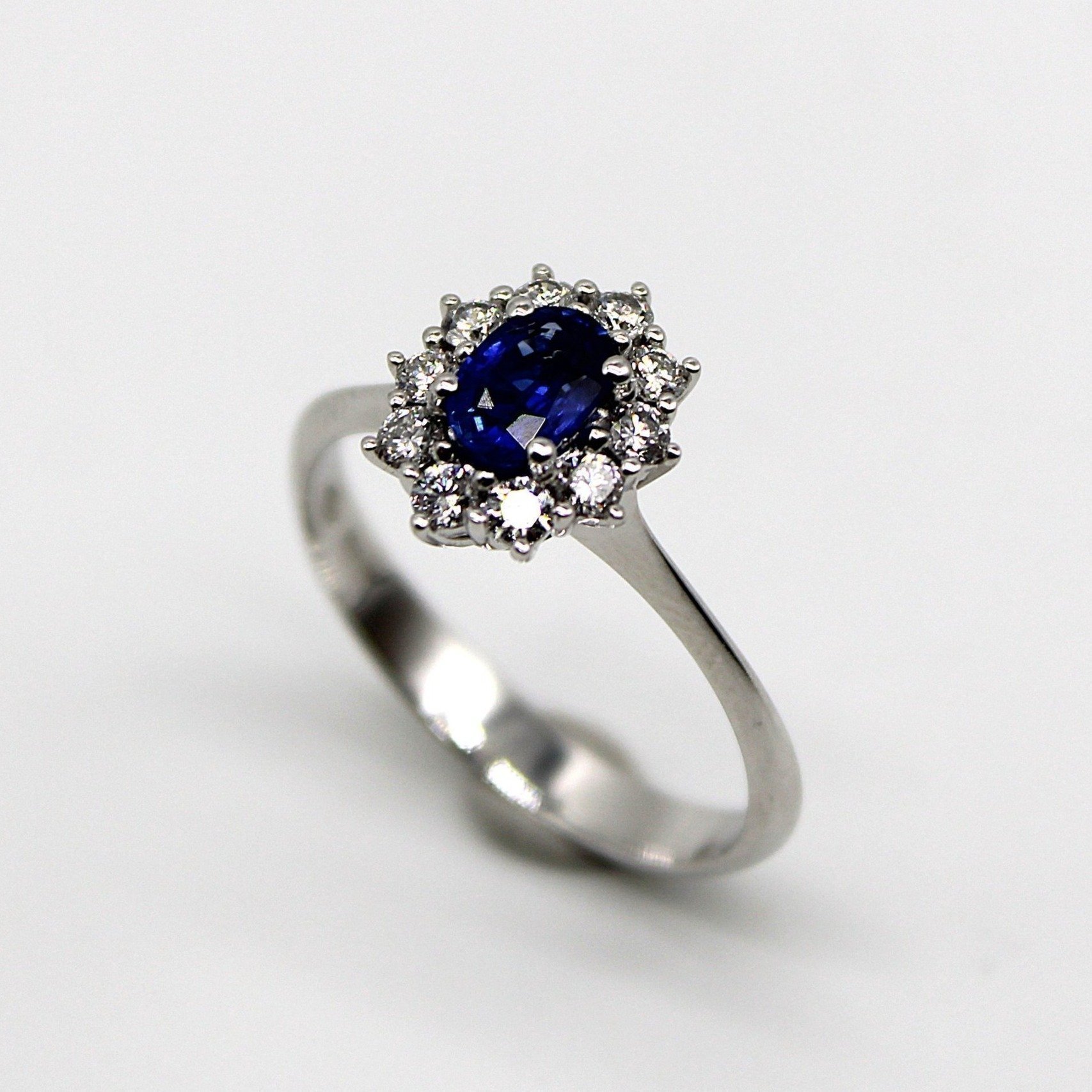 Vacker haloring i 18K vitguld med äkta safir och diamanter (1,17ctv, stl 16,8mm)