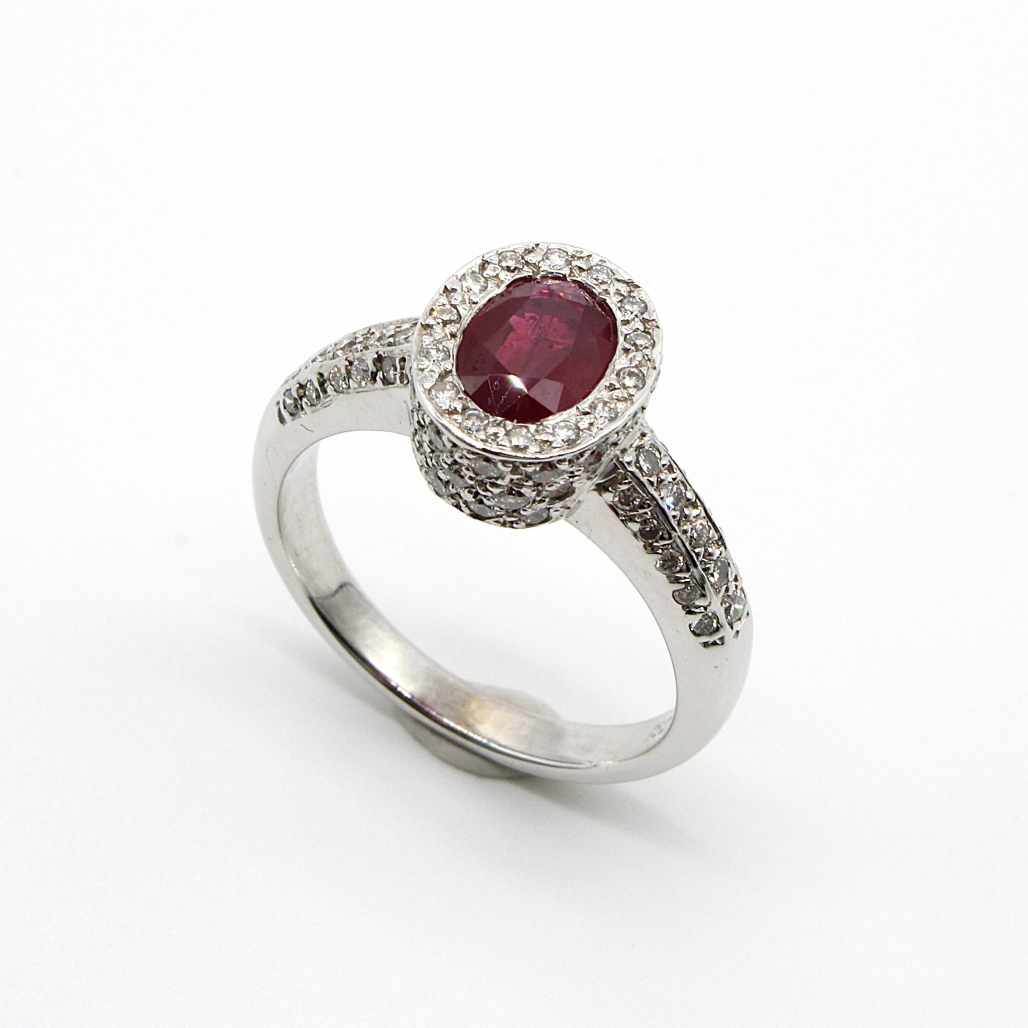 Halo och pavé äkta rubin- och diamantring i 18K vitguld (1,14ctv, stl 17,55mm)