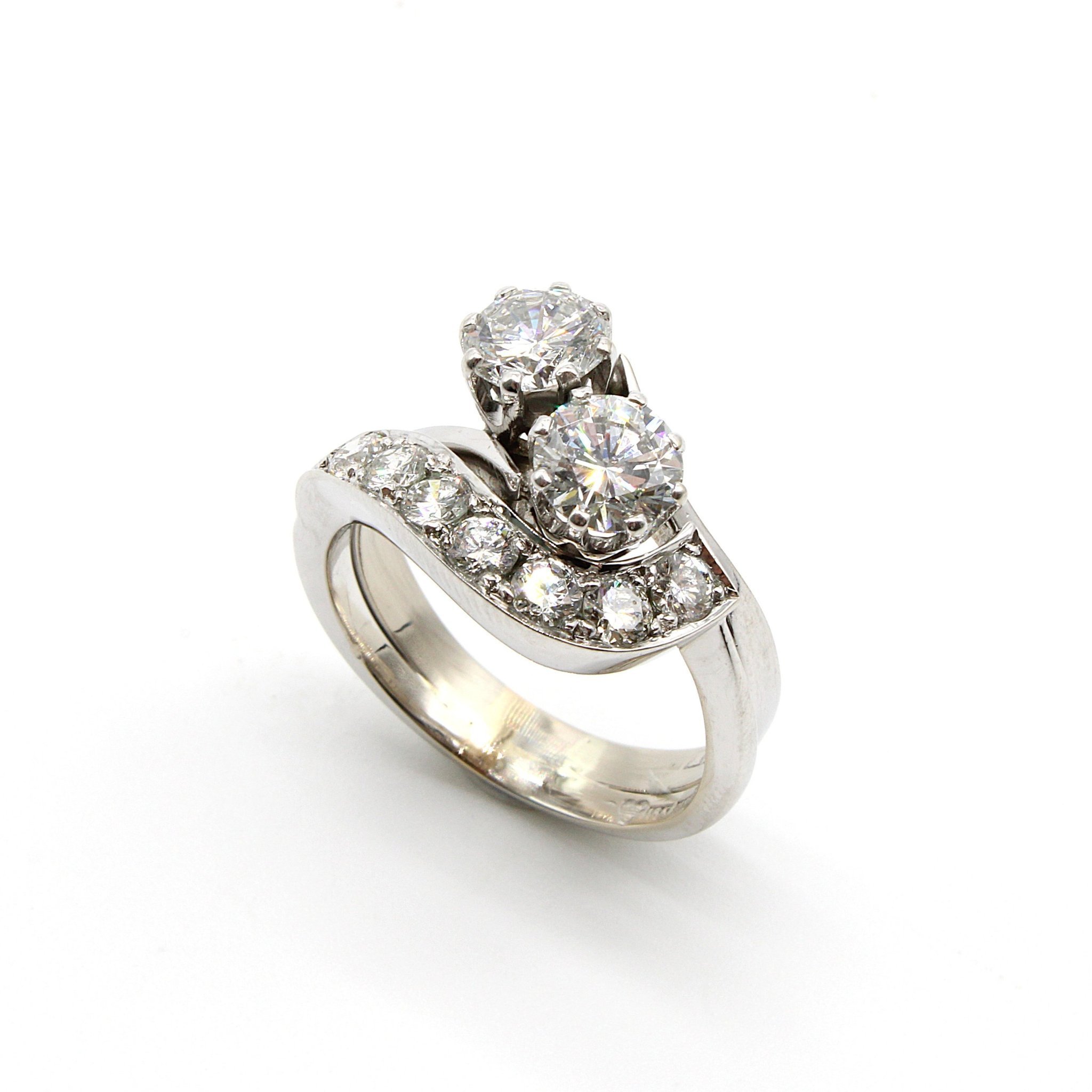 Lyxig 2-stens diamantring i 18K vitguld med sidodiamanter (1,75ctv, stl 16,9mm)