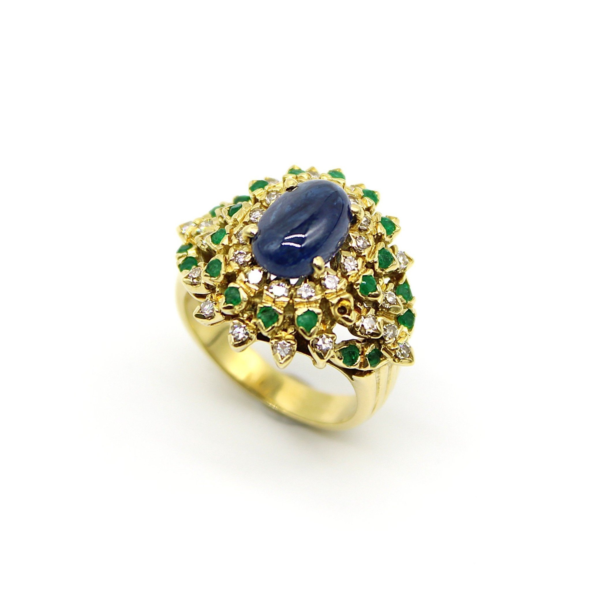 Statement ring i 18K guld med safir, diamanter och gröna stenar (stl 16,5mm)