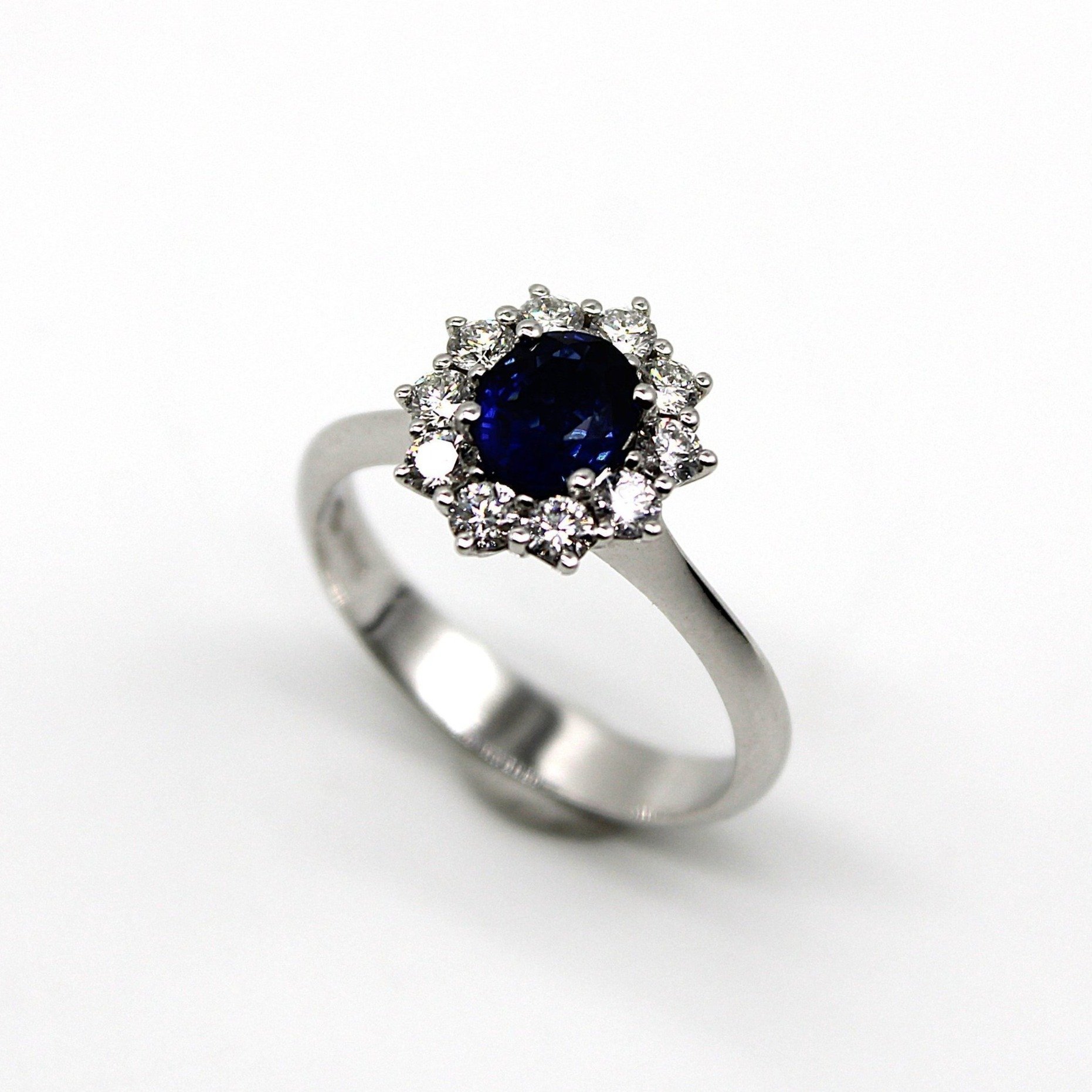 Vacker haloring i 18K vitguld med äkta safir och diamanter (1,17ctv, stl 16,8mm)