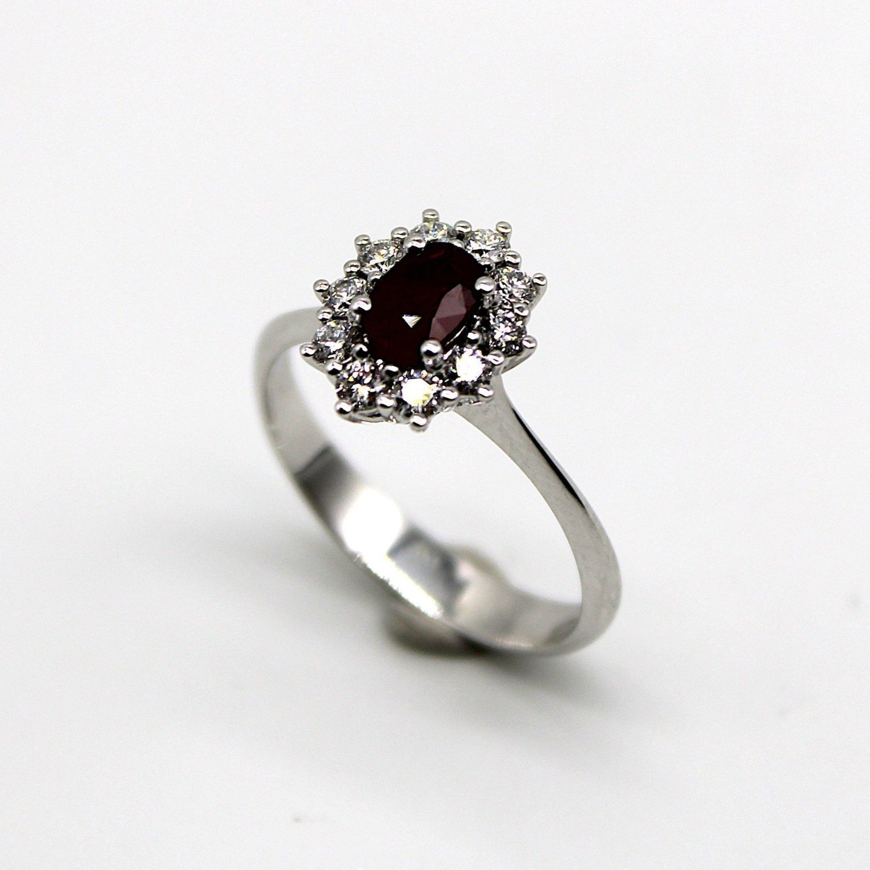 Vacker haloring i 18K vitguld med äkta diamanter och rubin (0,74ctv, stl 17,1mm)